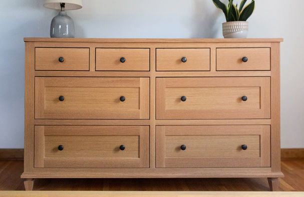 This dresser is built from rift white oak wood. Designed with a him and her side. Perfect for a primary bedroom. Featuring eighteen inch, soft close, dovetail drawers. Be sure to check out the legs holding up this solid dresser.